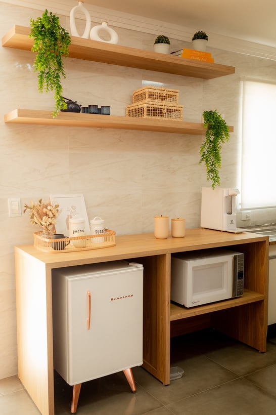 Cozinha com balcão grande em madeira, três bancos em palha, prateleiras decoradas, outro balcão para apoio com frigobar, microondas e filtro de água, tudo muito moderno.