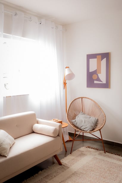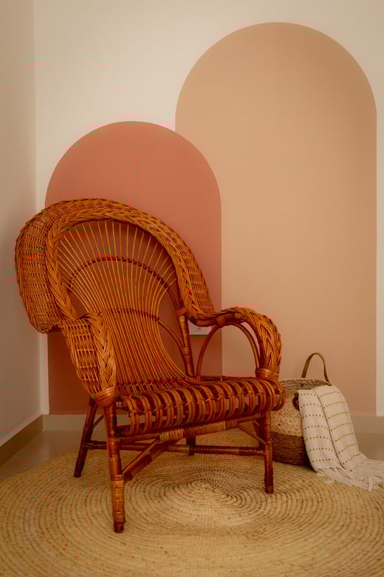 Temos um ambiente com uma cadeira lindíssima em vime e pintura na parede, tapete de palha e composição conforme necessidade da produção.