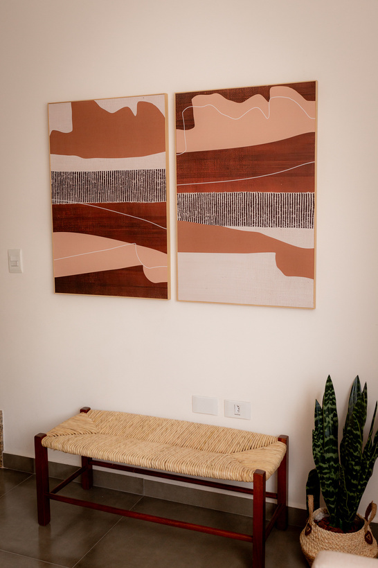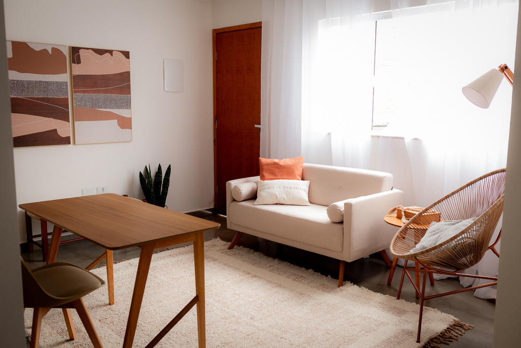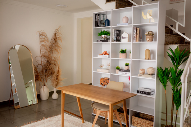 Nossa sala é composta por quatro cenários, sofá namoradeira com almofadas para um ambiente mais aconchegante e uma mesinha lateral de apoio. Escrivaninha com estante decorada atrás. Banco em palha, com dois quadros grandes e um vaso de planta ao lado. Cadeira moderna em vime, com uma linda luminária de chão, cachepô de palha ao lado e um lindo tapete para integrar o ambiente. Espelho de chão com vaso de pampas e arara de apoio para produção.