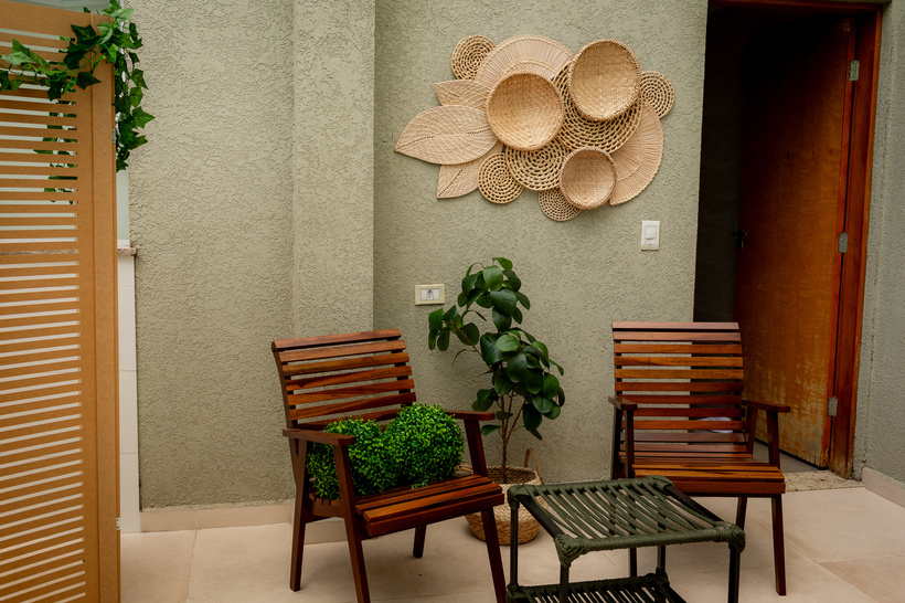 Esse ambiente é nosso queridinho, de um lado com duas cadeiras de madeira, mesa de centro, composição de cestos na parede e um vaso entre as cadeiras.