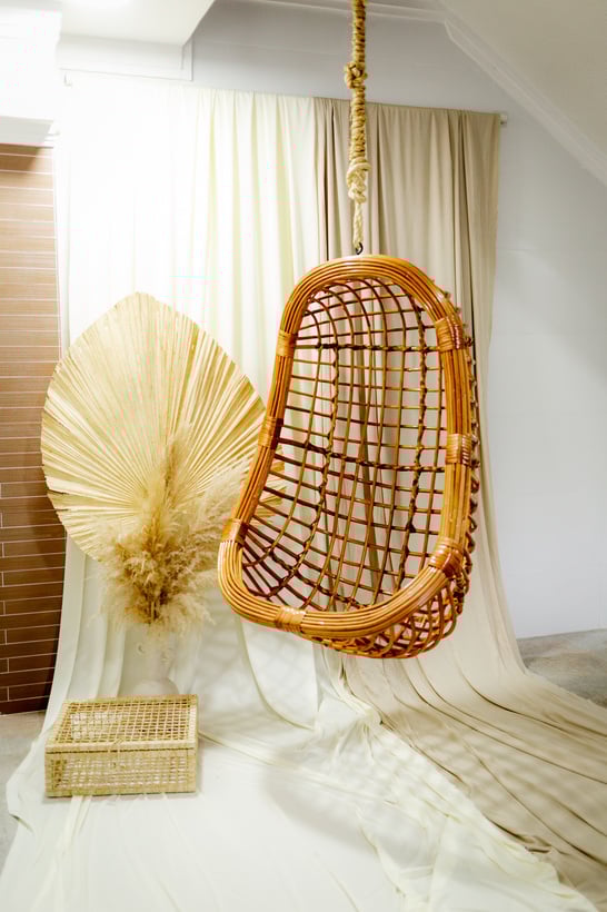 Logo na entrada temos um lindo balanço em vime, com decoração modular, o que fica livre para compor sua produção.