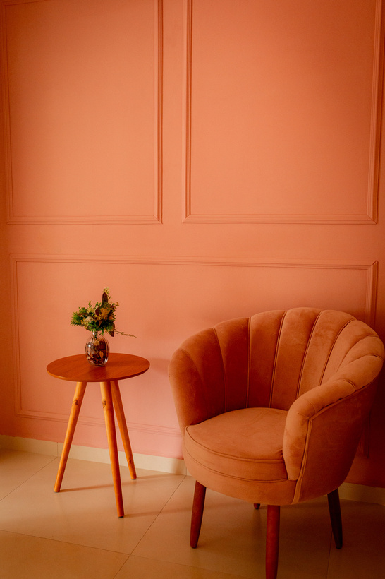 E o Hall com parede rosa envelhecido com boiserie da mesma cor, com uma cadeira de pétalas e mesa lateral de apoio.