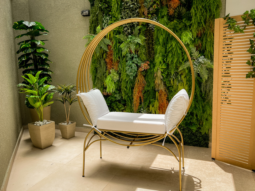 No outro lado jardim vertical com uma cadeira meia lua dourada com estofados branco e vasos para dar mais verde ao ambiente.