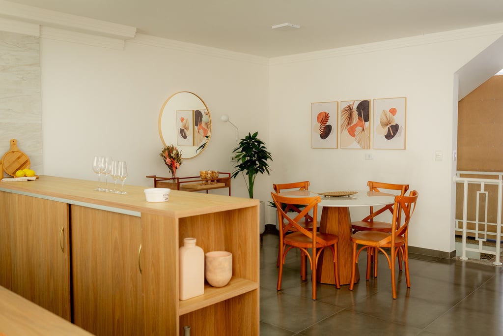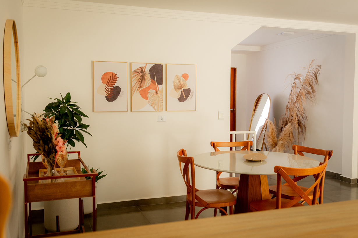 Ambiente integrado com mesa de jantar redonda com quatro cadeiras, carrinho bar para apoio, linda luminária de parede, vasos e quadros para compor ambiente.
