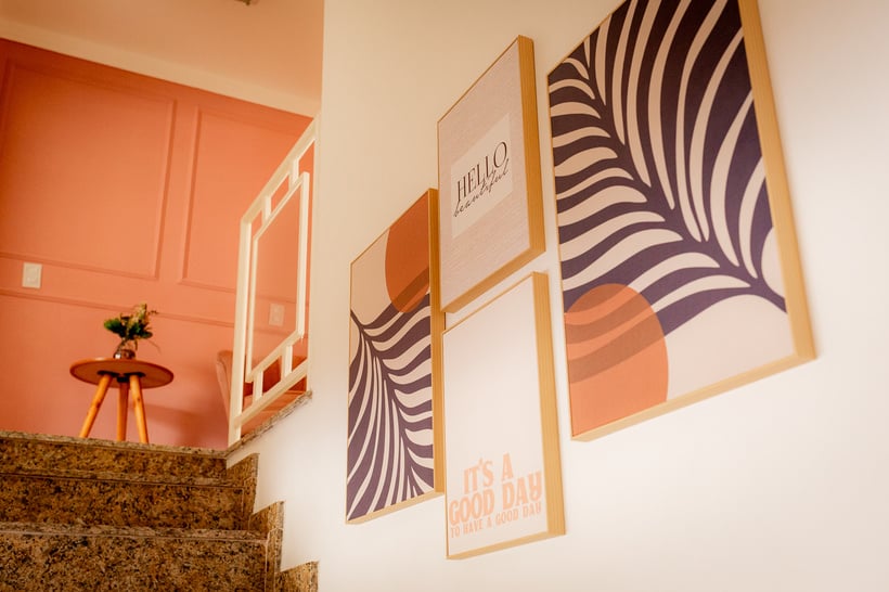 Escada com composição de quadros.